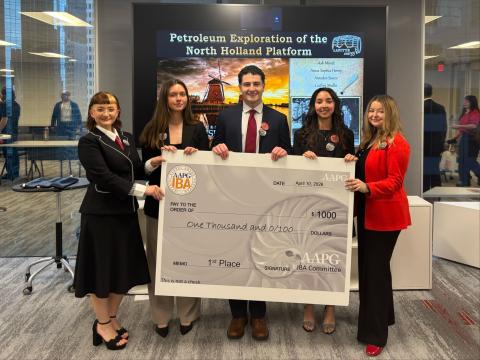 Mon, 04/20/2026 - 5:43pmProud to share that the IBA team at University of Louisiana at Lafayette earned 1st place at the North American Semifinals after ten challenging weeks filled with sleepless nights, collaboration, and nonstop problem‑solving. This experience pushed the team, which includes Myllah Brown, Caitlyn Mullis, Anna-Sophia Henry, Ashley Mindt, and Amadeo Suazo, to grow tremendously as geologists, critical thinkers, and teammates. Their industry advisors Mary Broussard & Brian Brennan, young professional mentor Peyton Dardeau, and faculty advisors Dr. Rui Zhang & William Finley provided guidance, insight, and support throughout the process. The team's performance follows a legacy of success in the competition, with student teams from UL winning the regional competition 10 times (2008, 2010, 2012, 2014, 2018, 2020, 2021, 2022, 2023, and now 2026) and the international competition three times (2012, 2014, and 2018). This year's team will be representing not only the state and university, but all of North America at the International IBA Competition in Houston, Texas on August 17th!